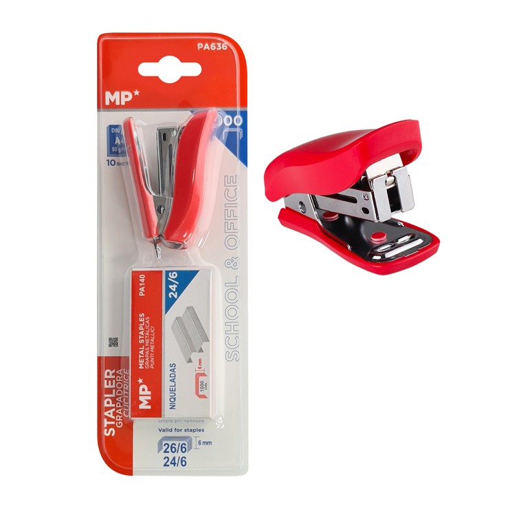 Συρραπτικό συμβατό με ανταλλακτικά τύπου 24/6 και 26/6. Στη συσκευασία συμπεριλαμβάνεται πακέτο ανταλλακτικών συρραπτικών 24/6 1000τμχ. Το συρραπτικό PA636 έχει ιδιαίτερα μικρό και κομψό design και μπορεί να συρράψει έως και 10 φύλλα, με μέγιστη απόσταση από την άκρη του φύλλου τα 20mm.