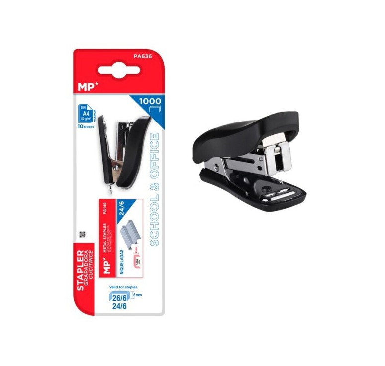 Συρραπτικό συμβατό με ανταλλακτικά τύπου 24/6 και 26/6. Στη συσκευασία συμπεριλαμβάνεται πακέτο ανταλλακτικών συρραπτικών 24/6 1000τμχ. Το συρραπτικό PA636 έχει ιδιαίτερα μικρό και κομψό design και μπορεί να συρράψει έως και 10 φύλλα, με μέγιστη απόσταση από την άκρη του φύλλου τα 20mm.