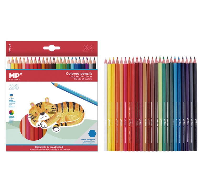 Σετ χρωματιστών ξυλομπογιών σε 24 αποχρώσεις, με ανθεκτική μύτη και εξαιρετική χρωματική απόδοση.