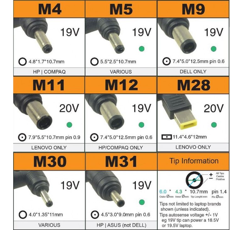 SeriesM28 20V 11*4.6*12mm LENOVO UltrabookM30 19V 4.0*1.35*11mm ASUSM31 19.5V 4.5*3.0*12mm pin0.6 HP Envy