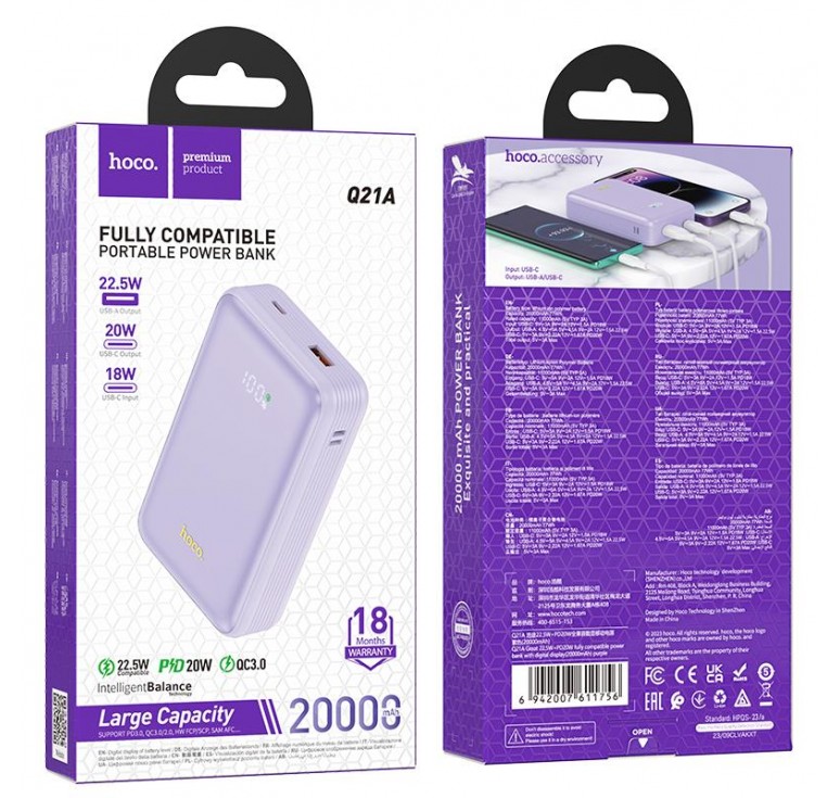 HOHO Q21A GREAT FULLY COMPATIBLE POWER BANK, 20.000mAh, 22.5W ΜΕ ΟΘΟΝΗ, ΜΩΒ