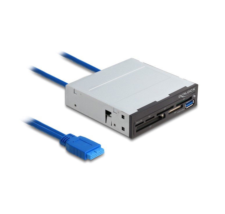 Αυτό το card reader της Delock συνδέεται εσωτερικά στην μητρική κάρτα του PC σας σε μια ελεύθερη θύρα USB 19 pin και μπορεί να τοποθετηθεί σε ένα ελεύθερο 3.5" bay του case σας. Διαθέτει έξι διαφορετικές υποδοχές ανάγνωσης καρτών και μια υποδοχή USB.