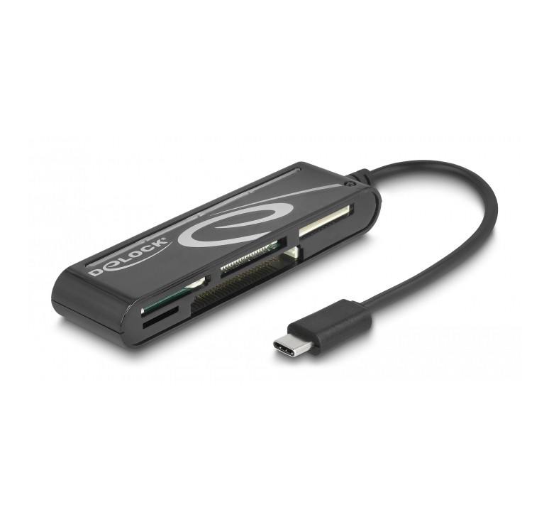 Αυτό το card reader της Delock διαθέτει 5 υποδοχές για την ανάγνωση και εγγραφή καρτών μνήμης micro SD, SD, CF, MS και xD. Συνδέεται απευθείας σε desktop ή laptop ή smartphone μέσω θύρας USB-C.
